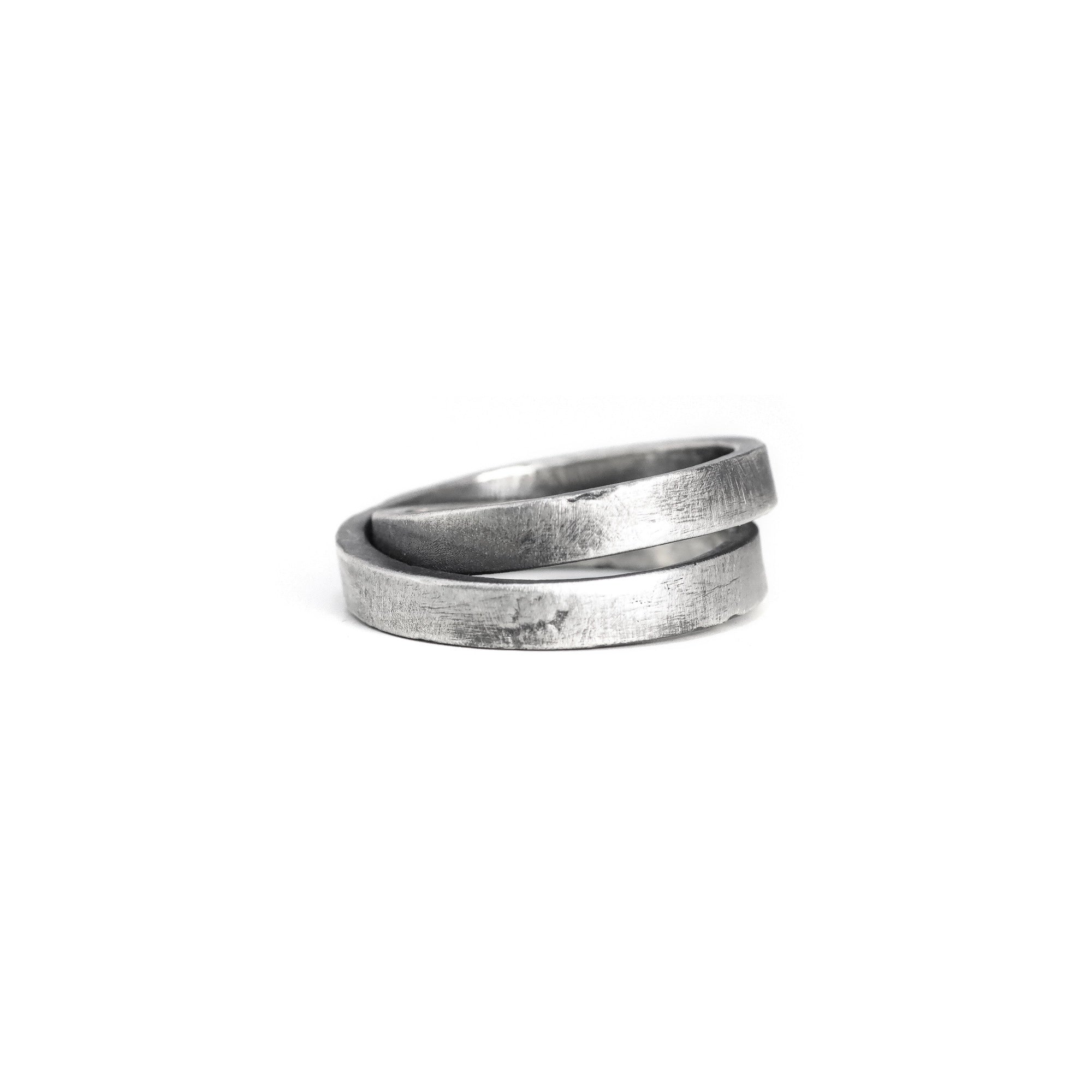 FORGED FROM A MOLTEN SQUARE INGOT OF STERLING SILVER, THIS RING IS BENT, TWISTED, AND SHAPED INTO A CAPTIVATING HELIX FORM. EACH CURVE IS SCULPTED BY HAND, THEN METICULOUSLY SOLDERED TO FORM A SEAMLESS WHOLE. THE RESULT IS A PIECE THAT DEFIES ITS ORIGINS — A STUDY IN MOVEMENT AND TENSION, FROZEN IN METAL.